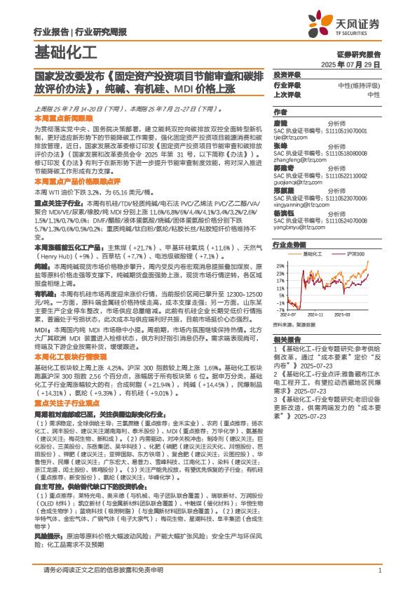 【18451】【天风证券】国家发改委发布《固定资产投资项目节能审查和碳排放评价办法》,纯碱、有机硅、MDI价格上涨 11小时前 7月 2 预览结束,本文件为PDF文档,一共21页,请购买后,下载查看 资源下载下载价格59 H币VIP免费升级VIP立即购买下载或充值问题请将订单号发送到:2907878669@qq.com ,我们会在24小时内为您处理 金融分析