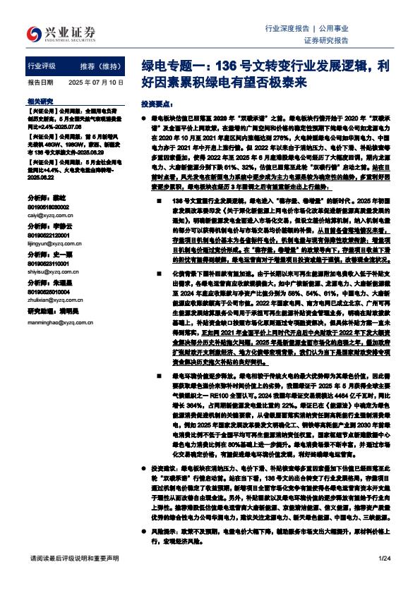 【19026E】公用事业行业绿电专题一:136号文转变行业发展逻辑利好因素累积绿电有望否极泰来 1周前 7月 6 预览结束,本文件为PDF文档,一共24页,请购买后,下载查看 资源下载下载价格59 H币VIP免费升级VIP立即购买下载或充值问题请将订单号发送到:2907878669@qq.com ,我们会在24小时内为您处理 金融分析