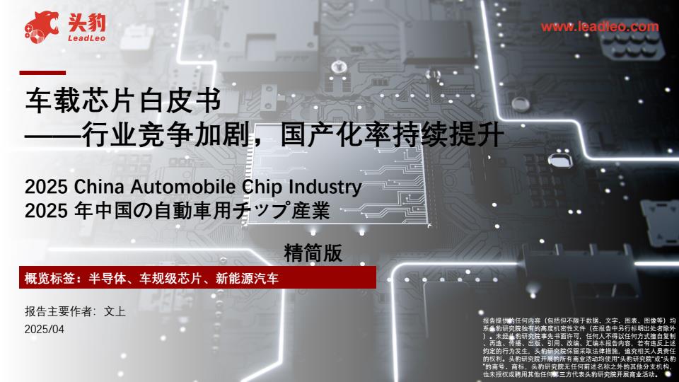 【19205E】【头豹研究院】车载芯片白皮书——行业竞争加剧,国产化率持续提升(精简版) 4天前 7月 3 预览结束,本文件为PDF文档,一共14页,请购买后,下载查看 资源下载下载价格59 H币VIP免费升级VIP立即购买下载或充值问题请将订单号发送到:2907878669@qq.com ,我们会在24小时内为您处理 汽车物流