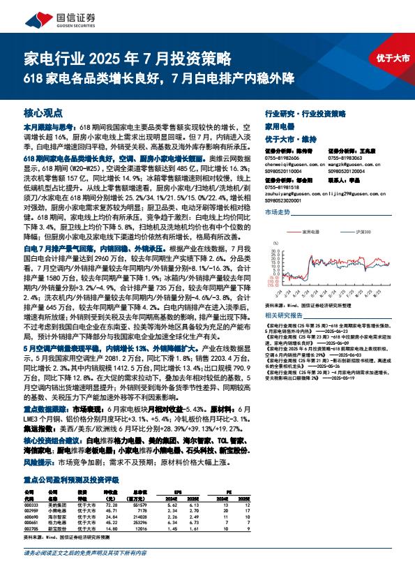 【19328E】【家电行业】2025年7月投资策略:618家电各品类增长良好,7月白电排产内稳外降 1周前 7月 15 预览结束,本文件为PDF文档,一共13页,请购买后,下载查看 资源下载下载价格59 H币VIP免费升级VIP立即购买下载或充值问题请将订单号发送到:2907878669@qq.com ,我们会在24小时内为您处理 消费零售