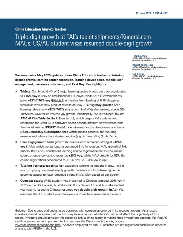 【19347E】【高盛】英文中国教育2025年5月追踪:好未来平板电脑出货量 学而思网月活跃用户数三位数增长;美国 澳大利亚学生签证恢复两位数增长 7天前 7月 4 预览结束,本文件为PDF文档,一共14页,请购买后,下载查看 资源下载下载价格59 H币VIP免费升级VIP立即购买下载或充值问题请将订单号发送到:2907878669@qq.com ,我们会在24小时内为您处理 教育