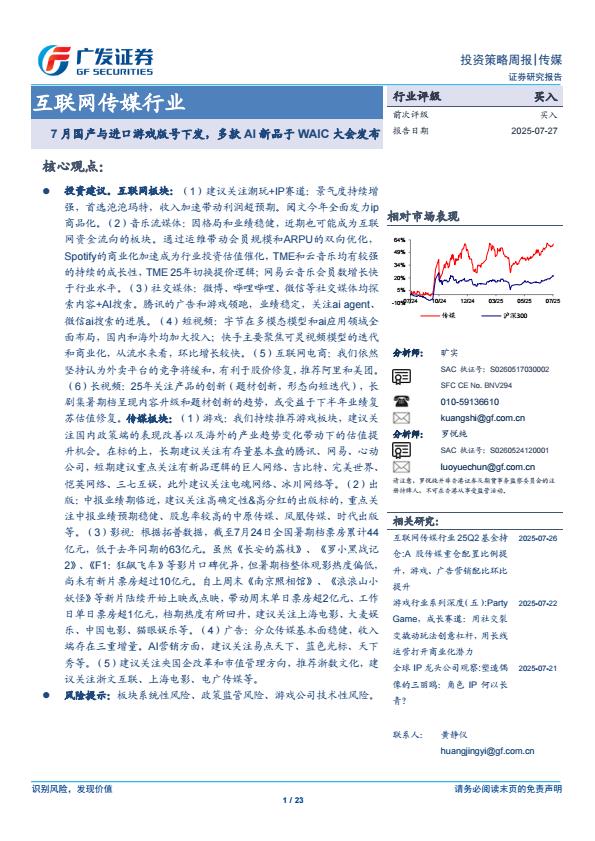 【20202E】【广发证券】互联网传媒行业:7月国产与进口游戏版号下发,多款AI新品于WAIC大会发布 1天前 8月 2 预览结束,本文件为PDF文档,一共23页,请购买后,下载查看 资源下载下载价格59 H币VIP免费升级VIP立即购买下载或充值问题请将订单号发送到:2907878669@qq.com ,我们会在24小时内为您处理 科技电子