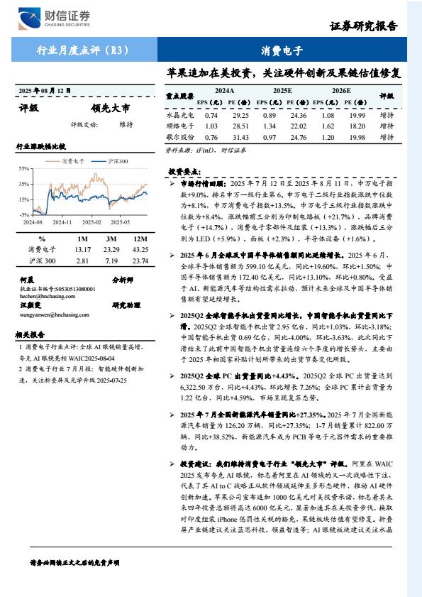 【20268E】【财信证券】消费电子行业月度点评:苹果追加在美投资,关注硬件创新及果链估值修复 1天前 8月 1 预览结束,本文件为PDF文档,一共14页,请购买后,下载查看 资源下载下载价格59 H币VIP免费升级VIP立即购买下载或充值问题请将订单号发送到:2907878669@qq.com ,我们会在24小时内为您处理 科技电子