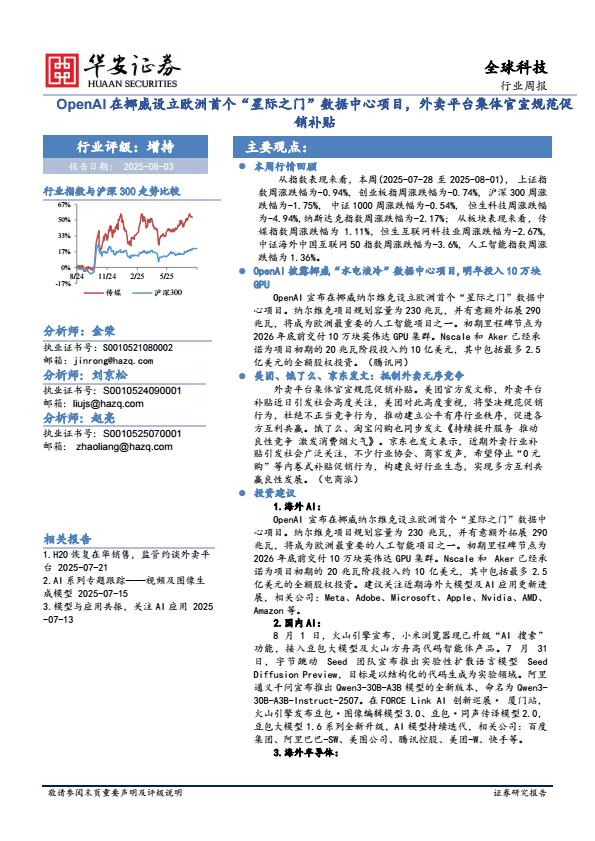 【20113E】【华安证券】全球科技行业周报:OpnAl在挪威设立欧洲首个“星际之门”数据中心项目,外卖平台集体官宣规范促销补贴 1天前 8月 2 预览结束,本文件为PDF文档,一共29页,请购买后,下载查看 资源下载下载价格59 H币VIP免费升级VIP立即购买下载或充值问题请将订单号发送到:2907878669@qq.com ,我们会在24小时内为您处理 金融分析