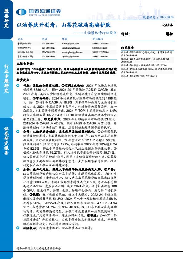 【20155E】【国泰海通证券】化妆品行业一文读懂林清轩招股书:以油养肤开创者,山茶花破局高端护肤 1天前 8月 2 预览结束,本文件为PDF文档,一共14页,请购买后,下载查看 资源下载下载价格59 H币VIP免费升级VIP立即购买下载或充值问题请将订单号发送到:2907878669@qq.com ,我们会在24小时内为您处理 金融分析