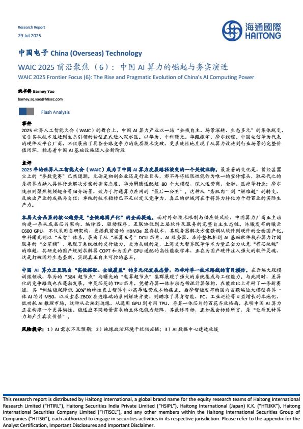 【20976E】【海通国际】中国电子行业WAIC2025前沿聚焦(6):中国AI算力的崛起与务实演进 1天前 8月 1 预览结束,本文件为PDF文档,一共12页,请购买后,下载查看 资源下载下载价格59 H币VIP免费升级VIP立即购买下载或充值问题请将订单号发送到:2907878669@qq.com ,我们会在24小时内为您处理 科技电子