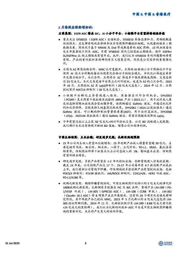 【20657E】【海通国际】医疗行业:2025年8月港股金股,持续看好创新药产业链,加大创新药和CXO龙头的配置 1天前 8月 2 预览结束,本文件为PDF文档,一共15页,请购买后,下载查看 资源下载下载价格59 H币VIP免费升级VIP立即购买下载或充值问题请将订单号发送到:2907878669@qq.com ,我们会在24小时内为您处理 医疗保健