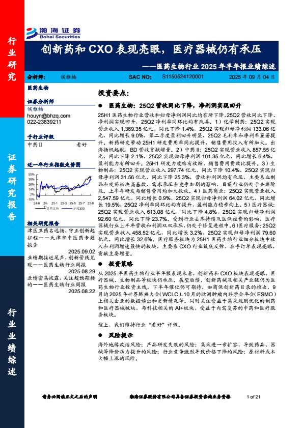 【22274E】医药生物行业2025年半年报业绩综述:创新药和CXO表现亮眼医疗器械仍有承压 1天前 9月 1 预览结束,本文件为PDF文档,一共21页,请购买后,下载查看 资源下载下载价格59 H币VIP免费升级VIP立即购买下载或充值问题请将订单号发送到:2907878669@qq.com ,我们会在24小时内为您处理 医疗保健