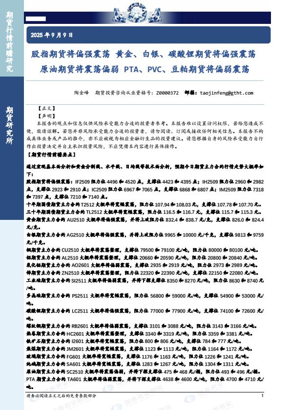 【22604E】【国泰期货】股指期货将偏强震荡 黄金、白银、碳酸锂期货将偏强震荡 原油期货将震荡偏弱 PTA、PVC、豆粕期货将偏弱震荡 2天前 9月 2 预览结束,本文件为PDF文档,一共38页,请购买后,下载查看 资源下载下载价格59 H币VIP免费升级VIP立即购买下载或充值问题请将订单号发送到:2907878669@qq.com ,我们会在24小时内为您处理 大宗商品