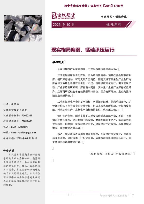【22546E】【宝城期货】锰硅季刊:现实格局偏弱,锰硅承压运行 3天前 9月 3 预览结束,本文件为PDF文档,一共14页,请购买后,下载查看 资源下载下载价格59 H币VIP免费升级VIP立即购买下载或充值问题请将订单号发送到:2907878669@qq.com ,我们会在24小时内为您处理 金融分析