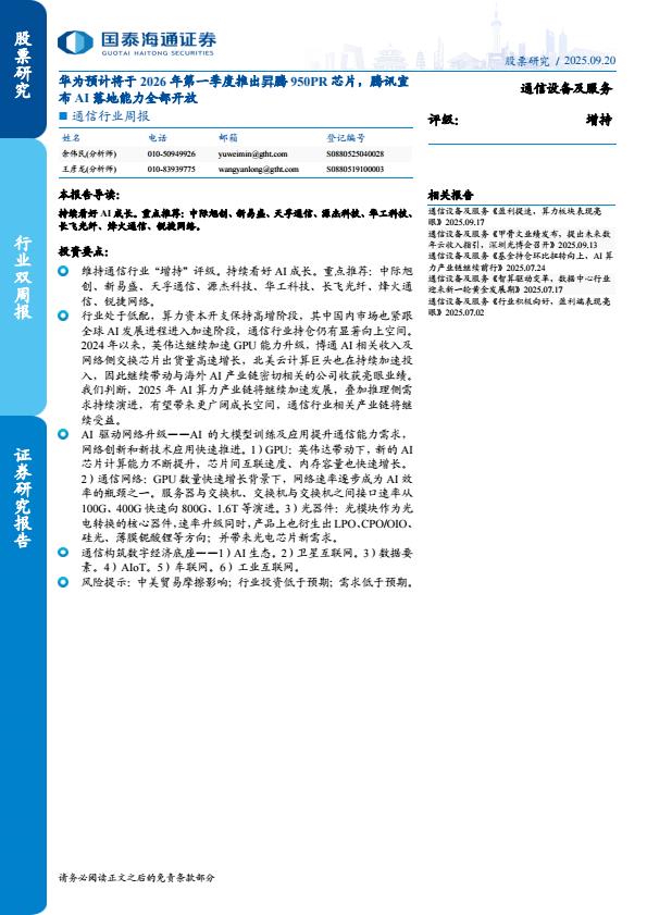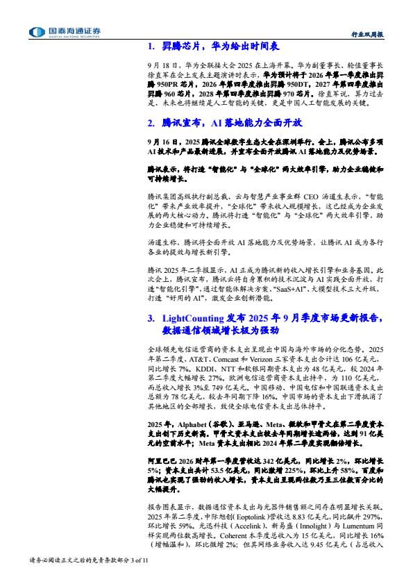 【22557E】【国泰海通】通信行业周报:华为预计将于2026年第一季度推出昇腾950PR芯片,腾讯宣布AI落地能力全部开放 21小时前 9月 1 预览结束,本文件为PDF文档,一共11页,请购买后,下载查看 资源下载下载价格59 H币VIP免费升级VIP立即购买下载或充值问题请将订单号发送到:2907878669@qq.com ,我们会在24小时内为您处理 科技电子