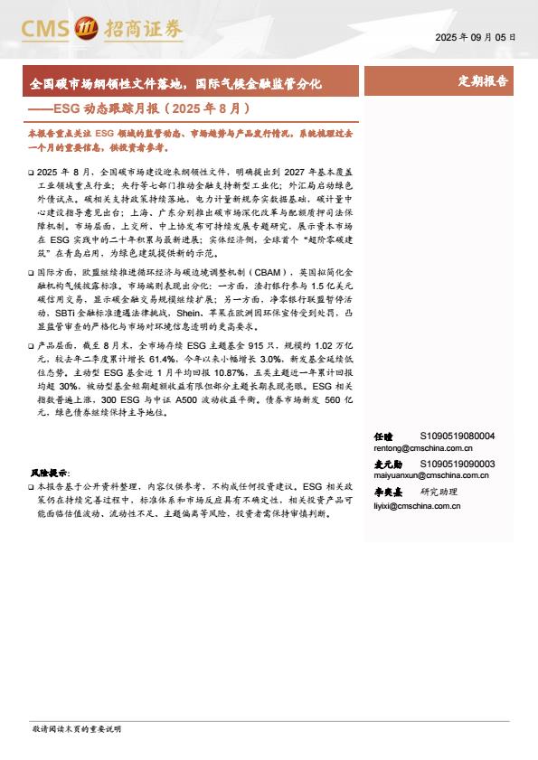 【21511E】【招商证券】ESG动态跟踪月报(2025年8月):全国碳市场纲领性文件落地,国际气候金融监管分化 14小时前 9月 1 预览结束,本文件为PDF文档,一共20页,请购买后,下载查看 资源下载下载价格59 H币VIP免费升级VIP立即购买下载或充值问题请将订单号发送到:2907878669@qq.com ,我们会在24小时内为您处理 金融分析