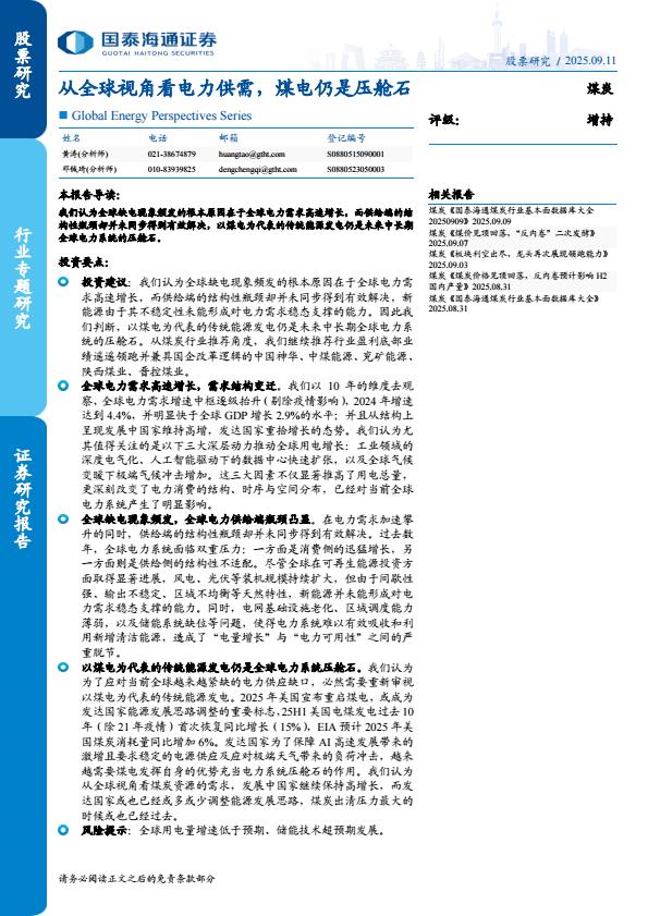 【21075E】【国泰海通证券】从全球视角看电力供需,煤电仍是压舱石 15小时前 9月 1 预览结束,本文件为PDF文档,一共28页,请购买后,下载查看 资源下载下载价格59 H币VIP免费升级VIP立即购买下载或充值问题请将订单号发送到:2907878669@qq.com ,我们会在24小时内为您处理 能源化工