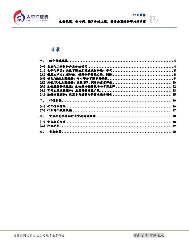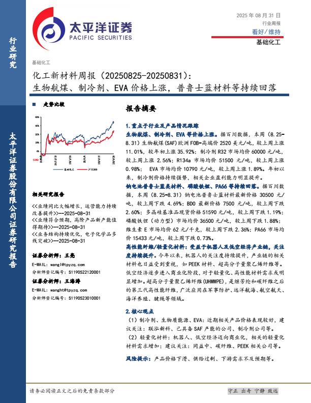 【21397E】【太平洋证券】化工新材料行业周报:生物航煤、制冷剂、EVA价格上涨,普鲁士蓝材料等持续回落 2天前 9月 2 预览结束,本文件为PDF文档,一共22页,请购买后,下载查看 资源下载下载价格59 H币VIP免费升级VIP立即购买下载或充值问题请将订单号发送到:2907878669@qq.com ,我们会在24小时内为您处理 能源化工
