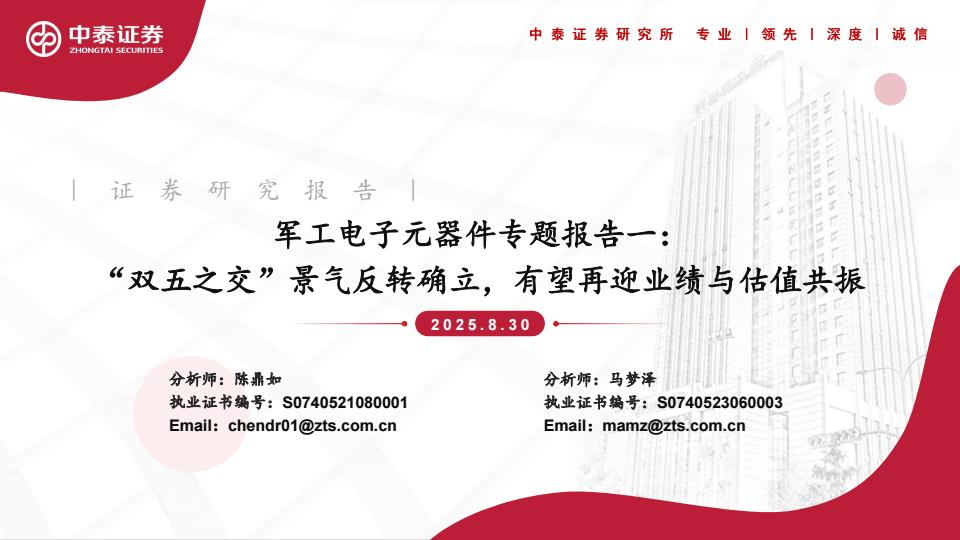 【22578E】军工行业电子元器件专题报告:“双五之交”景气反转确立,有望再迎业绩与估值共振 2天前 9月 2 预览结束,本文件为PDF文档,一共50页,请购买后,下载查看 资源下载下载价格59 H币VIP免费升级VIP立即购买下载或充值问题请将订单号发送到:2907878669@qq.com ,我们会在24小时内为您处理 科技电子