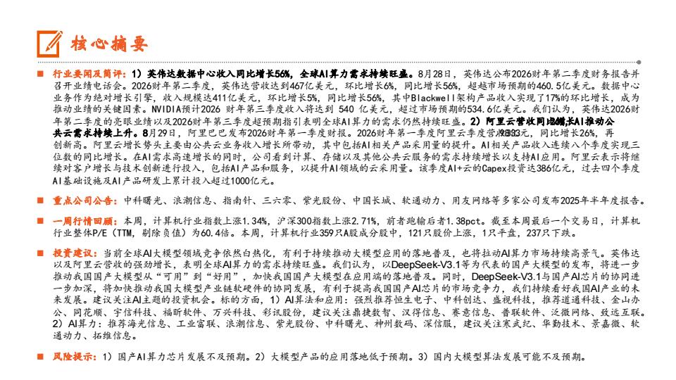 【21212E】【平安证券】计算机行业:英伟达、阿里云营收再创新高,全球AI算力及云需求持续旺盛 1天前 9月 1 预览结束,本文件为PDF文档,一共10页,请购买后,下载查看 资源下载下载价格59 H币VIP免费升级VIP立即购买下载或充值问题请将订单号发送到:2907878669@qq.com ,我们会在24小时内为您处理 科技电子