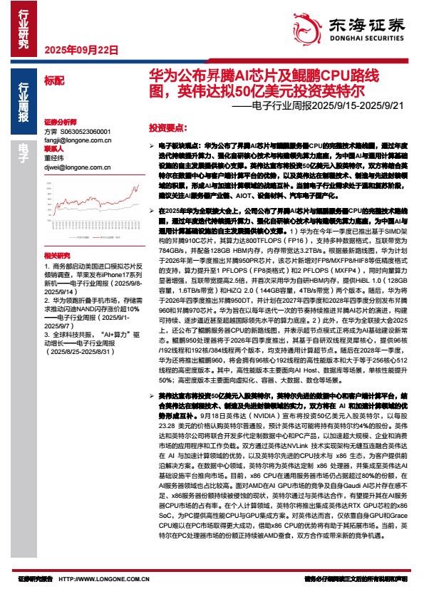 【21443E】【东海证券】电子行业周报:华为公布昇腾AI芯片及鲲鹏CPU路线图,英伟达拟50亿美元投资英特尔 14小时前 9月 1 预览结束,本文件为PDF文档,一共14页,请购买后,下载查看 资源下载下载价格59 H币VIP免费升级VIP立即购买下载或充值问题请将订单号发送到:2907878669@qq.com ,我们会在24小时内为您处理 科技电子