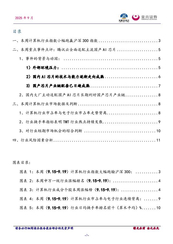 【21445E】【金元证券】计算机行业周点评:腾讯云全面适配主流国产AI芯片 21小时前 9月 1 预览结束,本文件为PDF文档,一共13页,请购买后,下载查看 资源下载下载价格59 H币VIP免费升级VIP立即购买下载或充值问题请将订单号发送到:2907878669@qq.com ,我们会在24小时内为您处理 科技电子