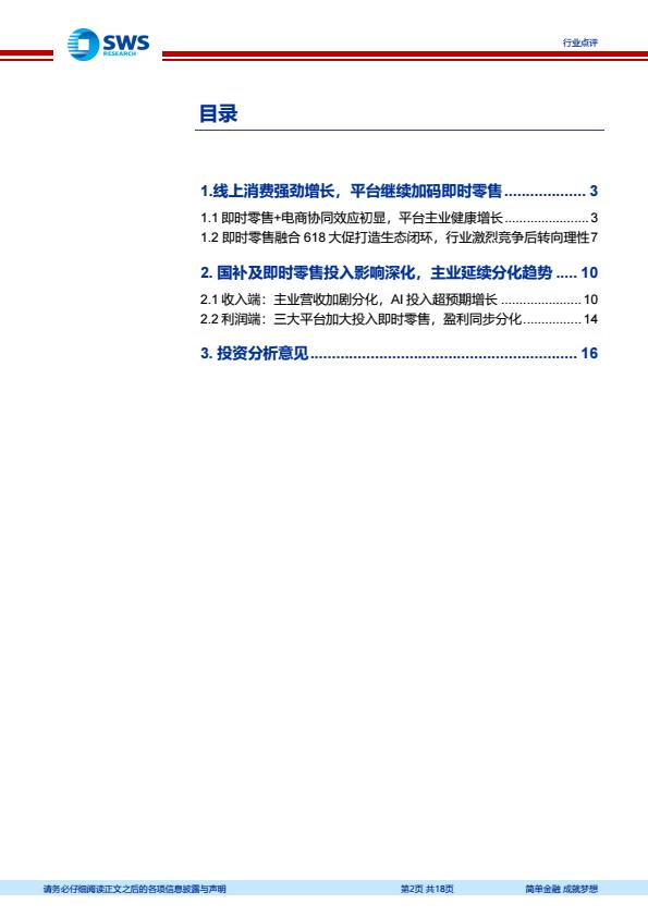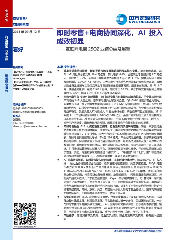 【22503E】【申万宏源】互联网电商行业25Q2业绩总结及展望:即时零售%2b电商协同深化,AI投入成效初显 2天前 9月 2 预览结束,本文件为PDF文档,一共18页,请购买后,下载查看 资源下载下载价格59 H币VIP免费升级VIP立即购买下载或充值问题请将订单号发送到:2907878669@qq.com ,我们会在24小时内为您处理 消费零售