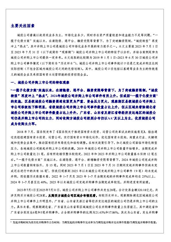 【22388E】一揽子化债以来,城投公司并购上市公司特征观察终稿 20小时前 9月 1 预览结束,本文件为PDF文档,一共14页,请购买后,下载查看 资源下载下载价格59 H币VIP免费升级VIP立即购买下载或充值问题请将订单号发送到:2907878669@qq.com ,我们会在24小时内为您处理 金融分析