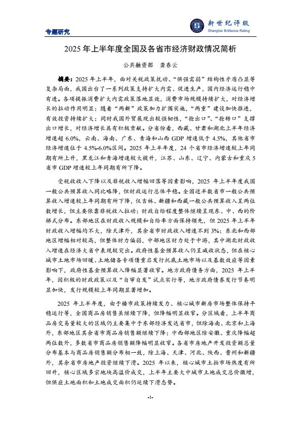 【22448E】2025年上半年度全国及各省市经济财政情况简析 3天前 9月 3 预览结束,本文件为PDF文档,一共14页,请购买后,下载查看 资源下载下载价格59 H币VIP免费升级VIP立即购买下载或充值问题请将订单号发送到:2907878669@qq.com ,我们会在24小时内为您处理 金融分析