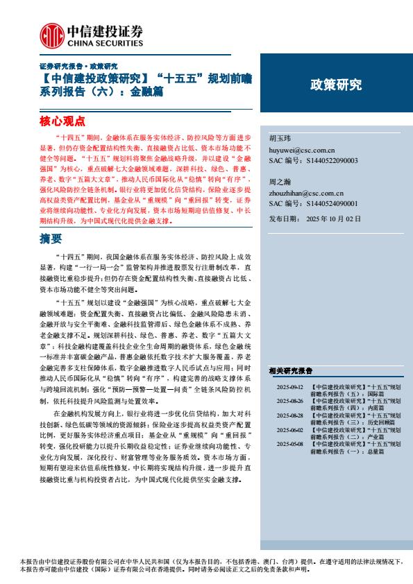 【23793E】【中信建投】【政策研究】“十五五”规划前瞻系列报告(六):金融篇 1天前 10月 1 预览结束,本文件为PDF文档,一共21页,请购买后,下载查看 资源下载下载价格59 H币VIP免费升级VIP立即购买下载或充值问题请将订单号发送到:2907878669@qq.com ,我们会在24小时内为您处理 金融分析