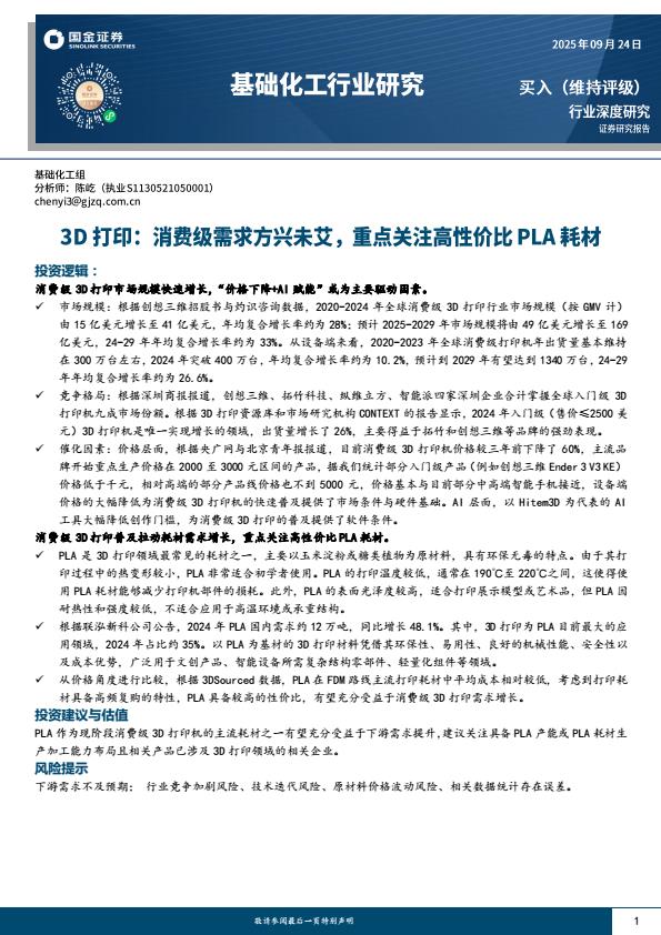 【23434E】基础化工行业:3D打印,消费级需求方兴未艾,重点关注高性价比PLA耗材 21小时前 10月 1 预览结束,本文件为PDF文档,一共19页,请购买后,下载查看 资源下载下载价格59 H币VIP免费升级VIP立即购买下载或充值问题请将订单号发送到:2907878669@qq.com ,我们会在24小时内为您处理 金融分析