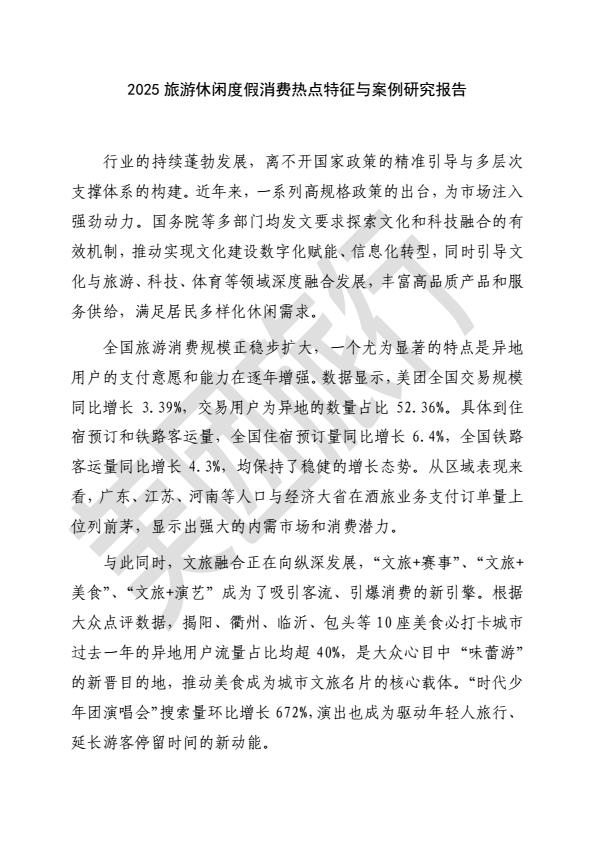 【23405E】【美团】2025年旅游休闲度假消费热点特征与案例研究报告 14小时前 10月 1 预览结束,本文件为PDF文档,一共15页,请购买后,下载查看 资源下载下载价格59 H币VIP免费升级VIP立即购买下载或充值问题请将订单号发送到:2907878669@qq.com ,我们会在24小时内为您处理 旅游酒店