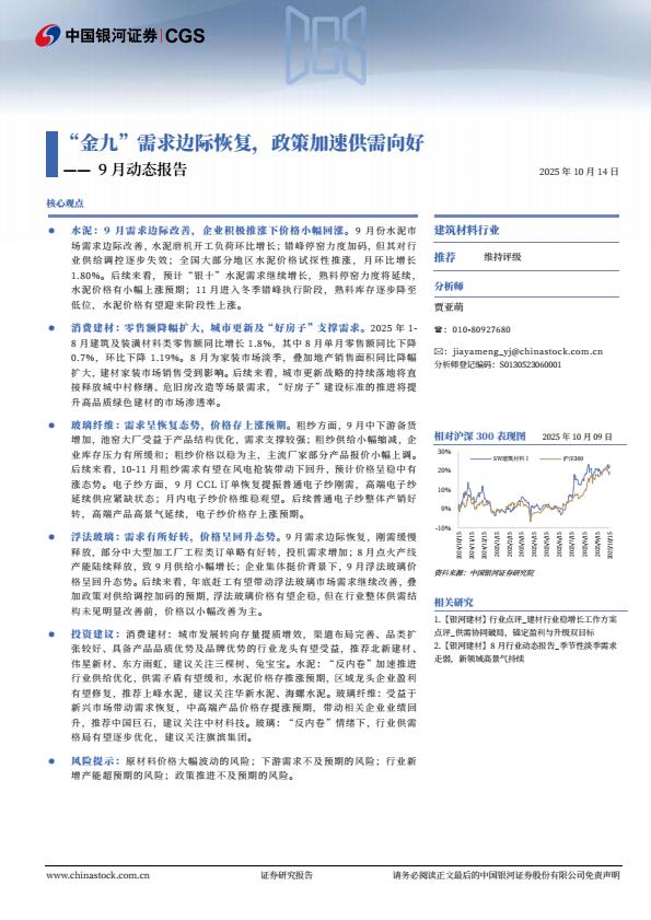 【23757E】【银河证券】建筑材料行业9月动态报告:“金九”需求边际恢复,政策加速供需向好 7小时前 10月 1 预览结束,本文件为PDF文档,一共21页,请购买后,下载查看 资源下载下载价格59 H币VIP免费升级VIP立即购买下载或充值问题请将订单号发送到:2907878669@qq.com ,我们会在24小时内为您处理 地产开发