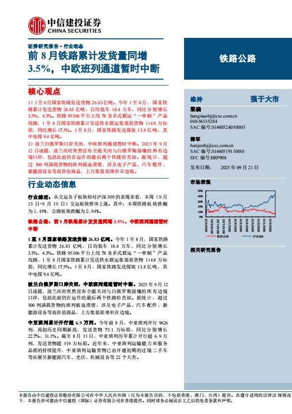 【23753E】【中信建投】铁路公路行业动态:前8月铁路累计发货量同增3.5%,中欧班列通道暂时中断 9小时前 10月 1 预览结束,本文件为PDF文档,一共11页,请购买后,下载查看 资源下载下载价格59 H币VIP免费升级VIP立即购买下载或充值问题请将订单号发送到:2907878669@qq.com ,我们会在24小时内为您处理 交通基建