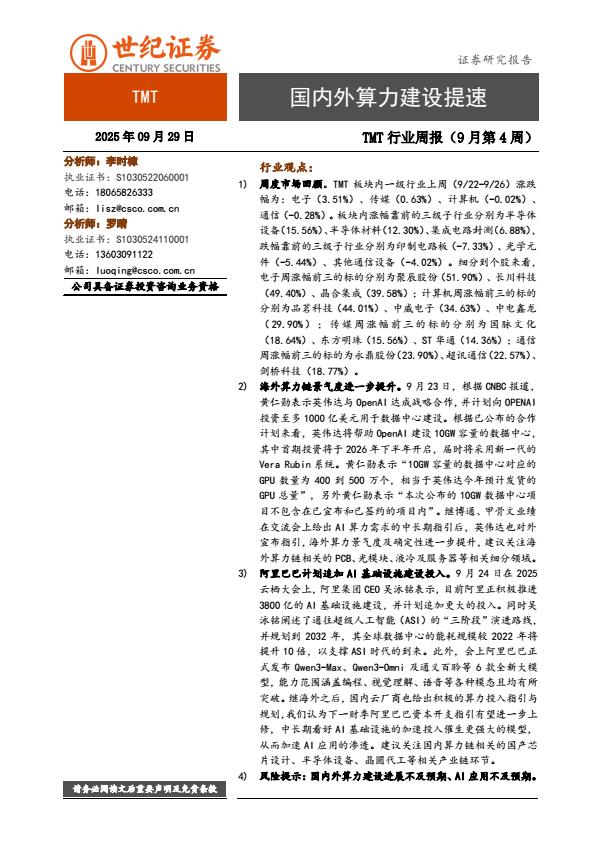 【23750E】【世纪证券】TMT行业周报(9月第4周):国内外算力建设提速 9小时前 10月 1 预览结束,本文件为PDF文档,一共14页,请购买后,下载查看 资源下载下载价格59 H币VIP免费升级VIP立即购买下载或充值问题请将订单号发送到:2907878669@qq.com ,我们会在24小时内为您处理 科技电子
