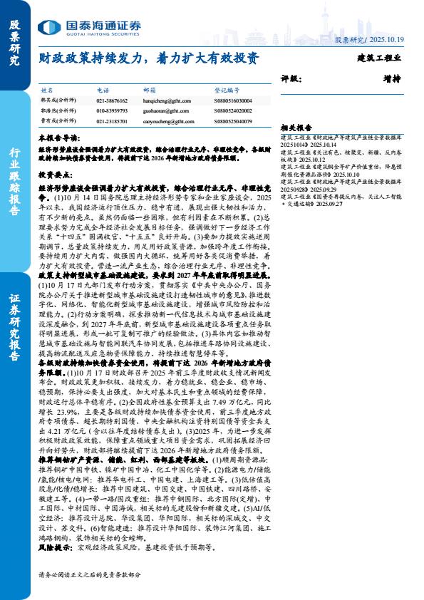 【23321E】【国泰海通】财政政策持续发力,着力扩大有效投资:建筑工程业 1天前 10月 1 预览结束,本文件为PDF文档,一共19页,请购买后,下载查看 资源下载下载价格59 H币VIP免费升级VIP立即购买下载或充值问题请将订单号发送到:2907878669@qq.com ,我们会在24小时内为您处理 交通基建