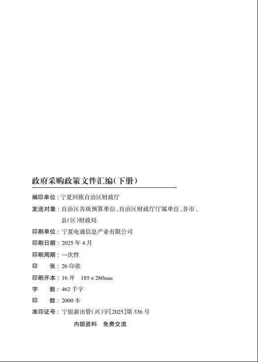 【23260E】【宁夏财政厅】2025政府采购政策文件汇编(下册) 15小时前 10月 1 预览结束,本文件为PDF文档,一共412页,请购买后,下载查看 资源下载下载价格59 H币VIP免费升级VIP立即购买下载或充值问题请将订单号发送到:2907878669@qq.com ,我们会在24小时内为您处理 银行金融