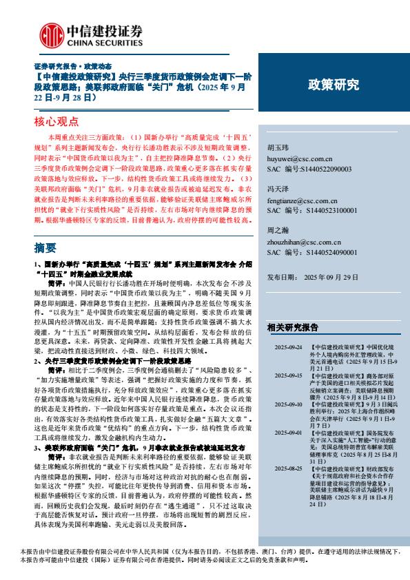 【23547E】【中信建投】政策研究:央行三季度货币政策例会定调下一阶段政策思路;美联邦政府面临“关门”危机(2025年9月22日9月28日) 2周前 10月 9 预览结束,本文件为PDF文档,一共14页,请购买后,下载查看 资源下载下载价格59 H币VIP免费升级VIP立即购买下载或充值问题请将订单号发送到:2907878669@qq.com ,我们会在24小时内为您处理 金融分析