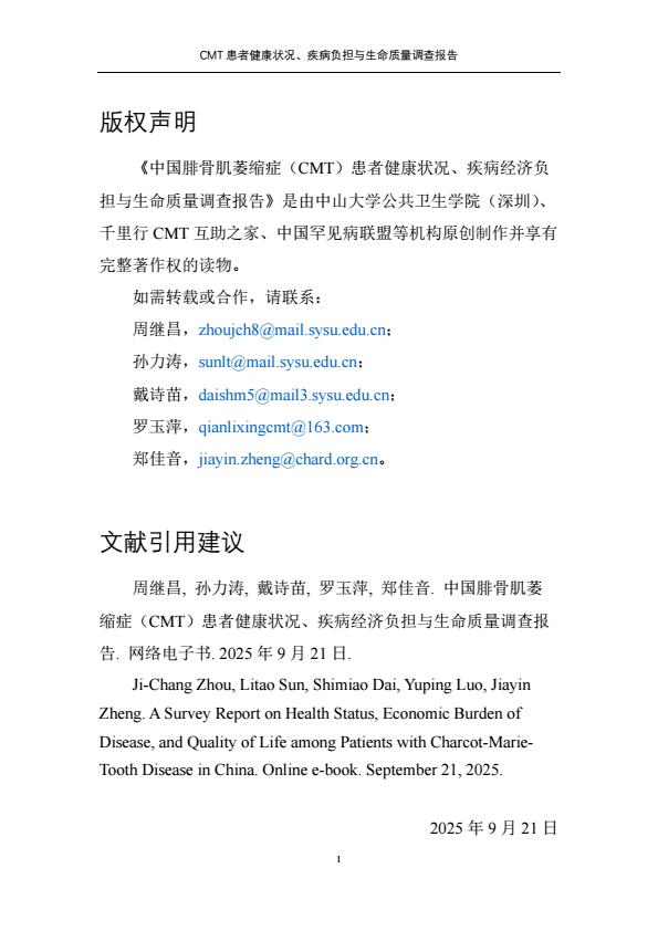 【23111E】【中山大学公共卫生学院(深圳)】2025中国腓骨肌萎缩症(CMT)患者健康状况、疾病经济负担与生命质量调查报告 3天前 10月 3 预览结束,本文件为PDF文档,一共100页,请购买后,下载查看 资源下载下载价格59 H币VIP免费升级VIP立即购买下载或充值问题请将订单号发送到:2907878669@qq.com ,我们会在24小时内为您处理 医疗保健