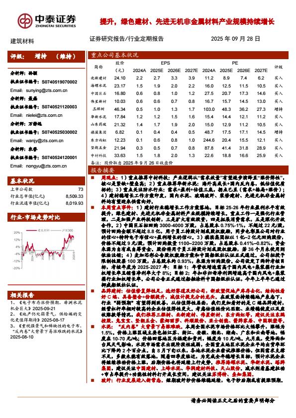 【23508E】【中泰证券】建筑材料行业:建材行业稳增长工作方案落地,目标2526年行业盈利水平有效提升,绿色建材、先进无机非金属材料产业规模持续增长 2天前 10月 1 预览结束,本文件为PDF文档,一共19页,请购买后,下载查看 资源下载下载价格59 H币VIP免费升级VIP立即购买下载或充值问题请将订单号发送到:2907878669@qq.com ,我们会在24小时内为您处理 交通基建