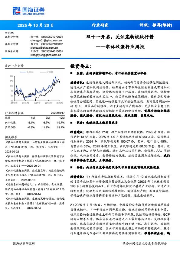 【23498E】【国海证券】双十一开启,关注宠物板块行情:农林牧渔行业周报 3天前 10月 4 预览结束,本文件为PDF文档,一共18页,请购买后,下载查看 资源下载下载价格59 H币VIP免费升级VIP立即购买下载或充值问题请将订单号发送到:2907878669@qq.com ,我们会在24小时内为您处理 农林牧渔