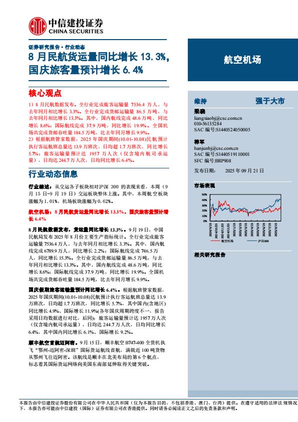 【23487E】【中信建投】航空机场行业动态:8月民航货运量同比增长13.3 2天前 10月 1 预览结束,本文件为PDF文档,一共20页,请购买后,下载查看 资源下载下载价格59 H币VIP免费升级VIP立即购买下载或充值问题请将订单号发送到:2907878669@qq.com ,我们会在24小时内为您处理 交通基建