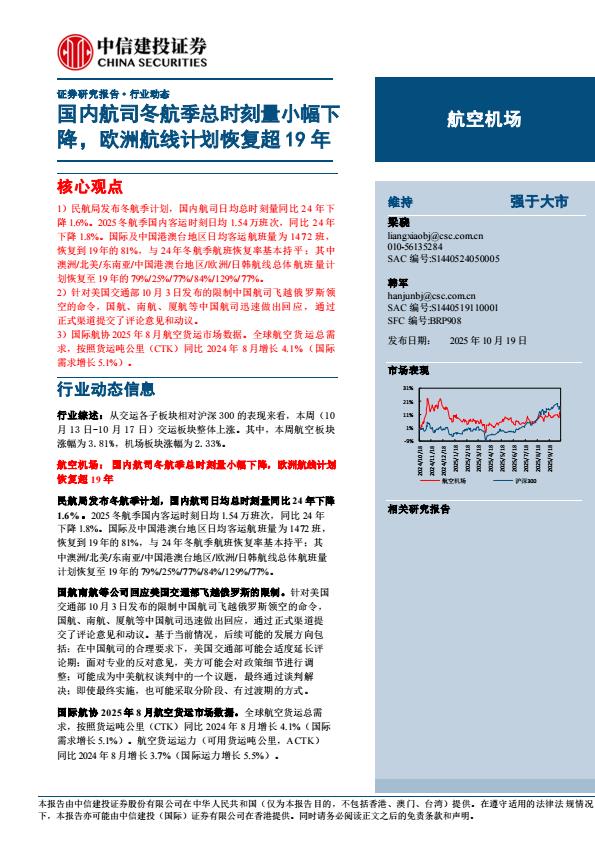 【23479E】【中信建投】航空机场行业动态:国内航司冬航季总时刻量小幅下降,欧洲航线计划恢复超19年 2天前 10月 2 预览结束,本文件为PDF文档,一共20页,请购买后,下载查看 资源下载下载价格59 H币VIP免费升级VIP立即购买下载或充值问题请将订单号发送到:2907878669@qq.com ,我们会在24小时内为您处理 交通基建