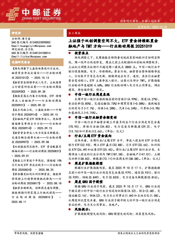 【23477E】【中邮证券】行业轮动周报:上证强于双创调整空间不大,ETF资金持续配置金融地产与TMT方向 2天前 10月 3 预览结束,本文件为PDF文档,一共16页,请购买后,下载查看 资源下载下载价格59 H币VIP免费升级VIP立即购买下载或充值问题请将订单号发送到:2907878669@qq.com ,我们会在24小时内为您处理 金融分析