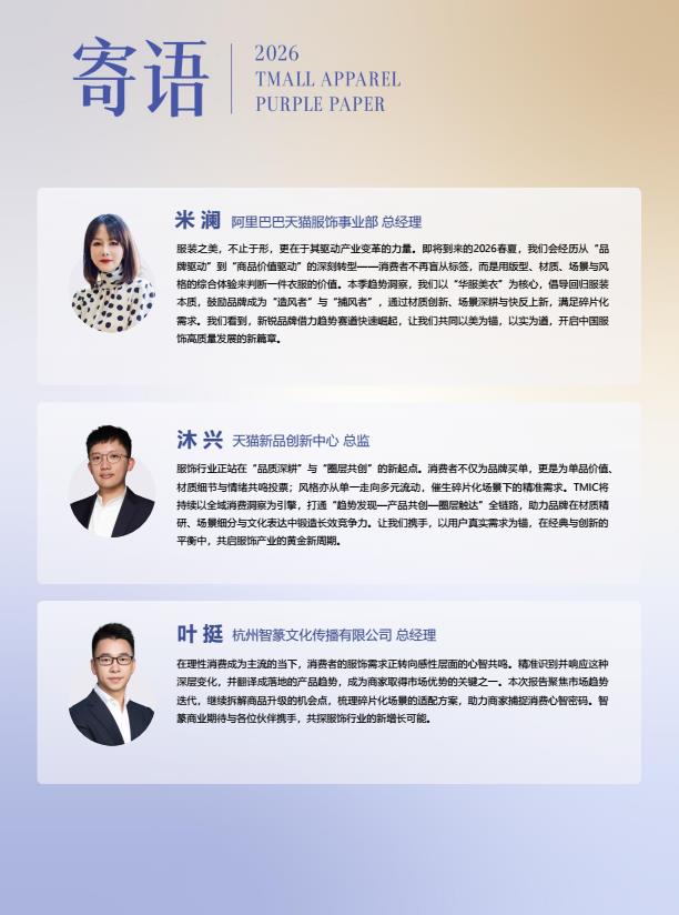 【23061E】2026春夏天猫服饰趋势紫宝书天猫服饰&智篆GI&天猫新品创新中心 2天前 10月 2 预览结束,本文件为PDF文档,一共51页,请购买后,下载查看 资源下载下载价格59 H币VIP免费升级VIP立即购买下载或充值问题请将订单号发送到:2907878669@qq.com ,我们会在24小时内为您处理 纺织服装
