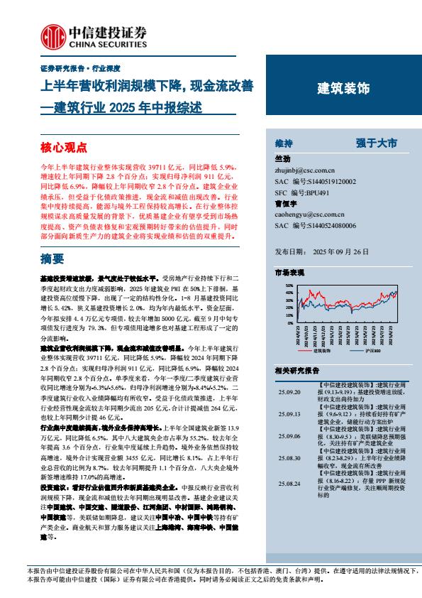 【23454E】【中信建投】建筑行业2025年中报综述:上半年营收利润规模下降,现金流改善 5小时前 10月 2 预览结束,本文件为PDF文档,一共21页,请购买后,下载查看 资源下载下载价格59 H币VIP免费升级VIP立即购买下载或充值问题请将订单号发送到:2907878669@qq.com ,我们会在24小时内为您处理 金融分析